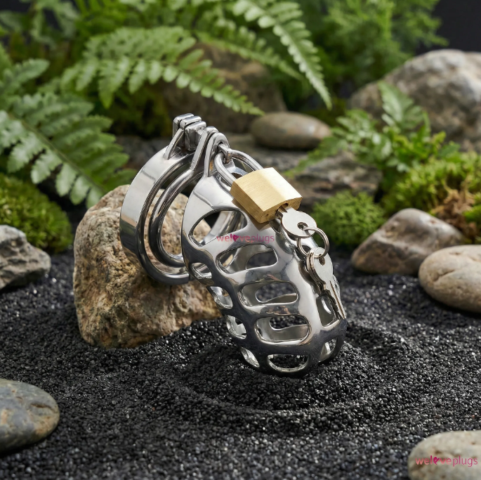 This steel device has a unique cobweb design that not only helps to ventilate but also allows you to clean your cock when taking a shower. In addition, you don't need to remove it when peeing, since it has a hole on the tip. This set includes three ring sizes, each with a rubber sleeve to protect your scrotum.