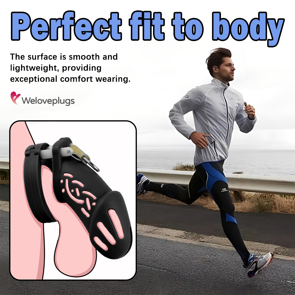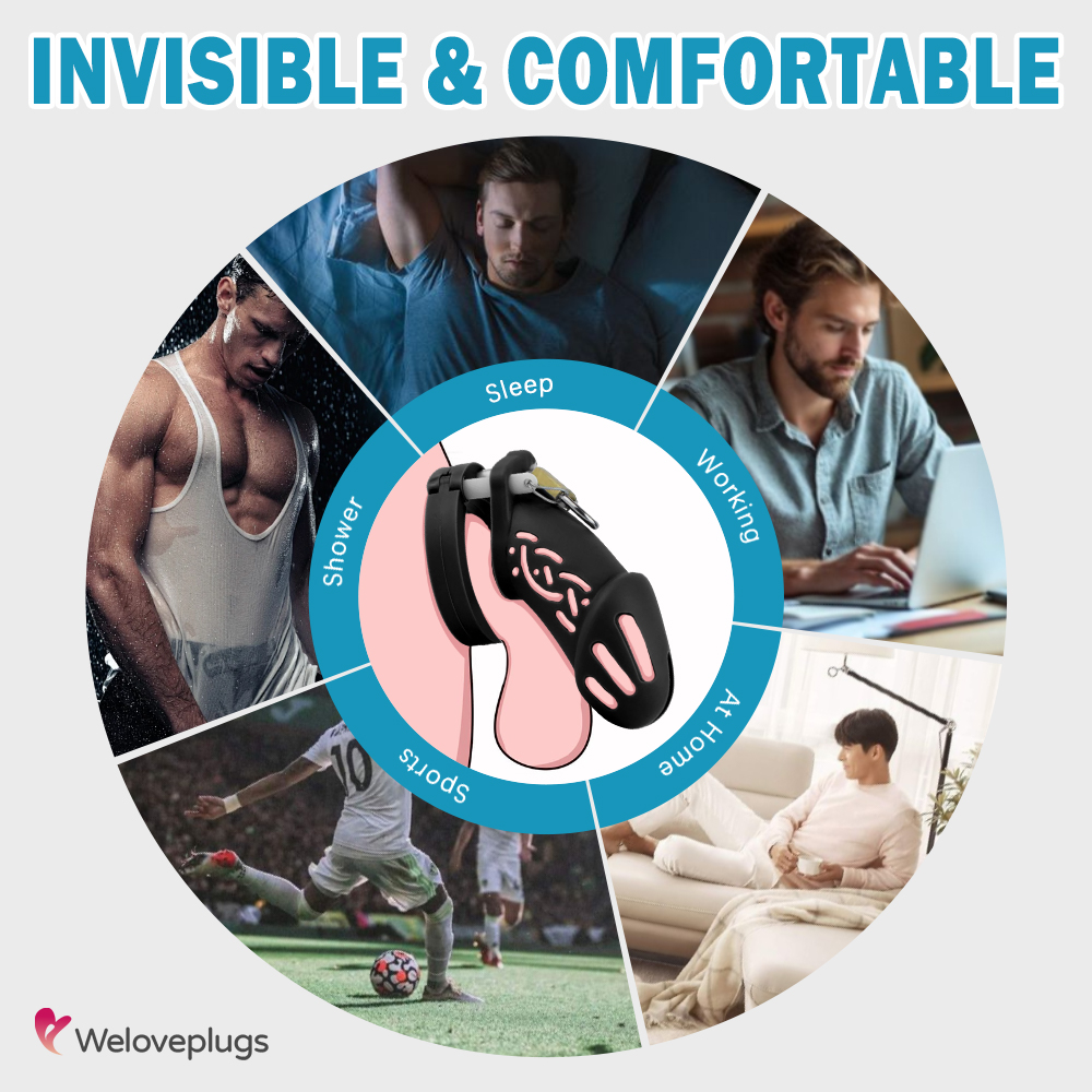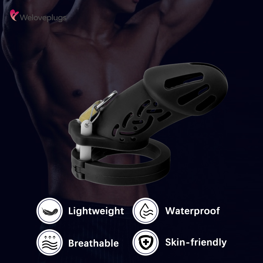 Made from high-quality Silicone material, this cock blocker device is quite easy to use too. Just slip the cock ring all the way behind the balls, then slide the cage over the cock, align the hinges of both plastic pieces, and then finally insert the key tumbler to hold it all together - easy peasy!