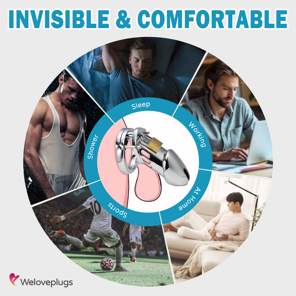 Most male chastity devices consist of rigid metal or plastic cages or tubes that fit around and over the penis and lock closed, preventing removal. This is one of the most common configurations: